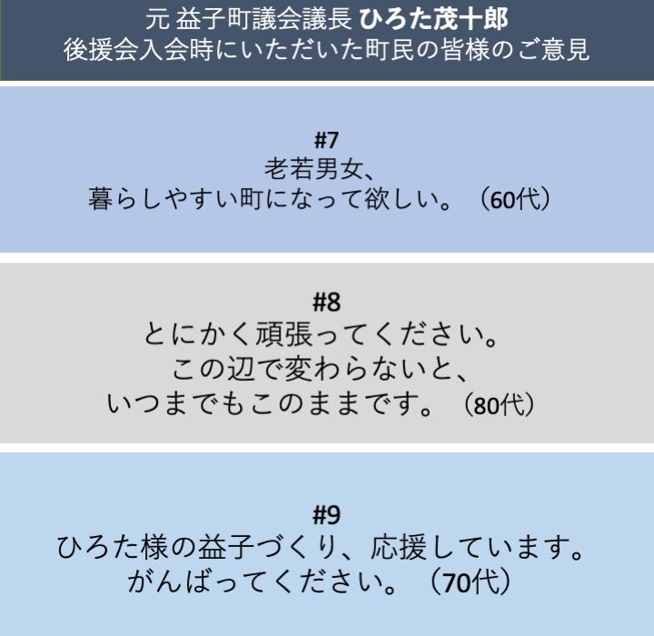 ご意見、ありがとうございます。老若男女、誰もが幸せな町に。本当に大切なことと思います。そのためには、今まで置き去りにされてきた生活インフラの整備、地域福祉計画の策定、他の市町より遅れていたり支援が不足しているところに力を入れないといけませんので、そこはしっかりやりたいと思います。また、80代の大先輩からの「この辺で変わらないと、いつまでもこのまま」というご意見、重く受け止めております。議員活動、そして監査役としての活動の中で、同じような危機感を感じて、今回の決意をした次第です。今後とも、よろしくご指導お願いします。